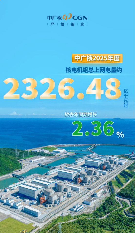 2026年1月8日,中國廣核電力股份有限公司發布信息公告,2025年1月至12月份,中國廣核電力股份有限公司運營管理的28台在運核電機組總發電量約為2470.13億千瓦時,較去年同期增長2.00%,總上網電量約為2326.48億千瓦時,較去年同期增長2.36%。