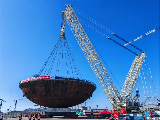 鋼製安全殼是核島的重要屏障,由底封頭、4個環段以及頂封頭共6個部分拚裝而成。此次吊裝的CV底封頭呈半球形結構,最大內徑約39.6米,高度約11.4米,吊裝總重量約843噸。
