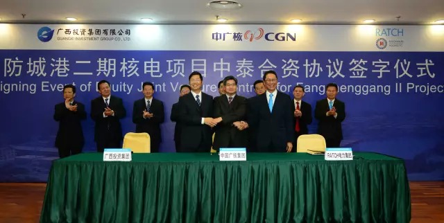 12月23日,中國廣核集團與廣西投資集團有限公司、泰國國家電力公司子公司RATCH在廣西南寧正式簽署了《防城港核電二期項目合資協議》。根據協議,三方將在中泰兩國政府間和平利用核能協議的基礎上,合資成立防城港核電二期項目公司,共同開發、建設和運營該項目。